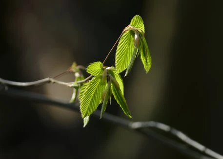 What opulence appears from the bud of a hornbeam! The newborn leaves look like three-headed alien insects, including wings and antennas. Hornbeams are one of the first to shoot into leaves, together with the elder, the hazel and the maple.