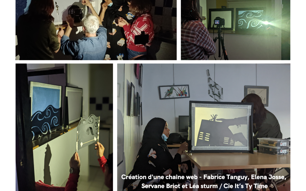 Comme l’édition de l’année passée, la cie a eu envie de traverser le conte mais avec comme point d’ancrage les anecdotes de vie, comment transformer une anecdote en un récit fabuleux. Les participants ont été amenés à échanger entre eux, élaborer une histoire qui a été travaillée avec la complicité de la professeure de Français Langue Etrangère d’Habitat Cité. Ensuite il y a eu la construction des silhouettes et l’expérimentation des possibles du théâtre d’ombres puis le temps de l’enregistrement de la narration et des bruitages. Le dernier jour a été consacré à la manipulation et à la prise de vue. De ces ateliers 4 vidéos ont été réalisées puis montées.
