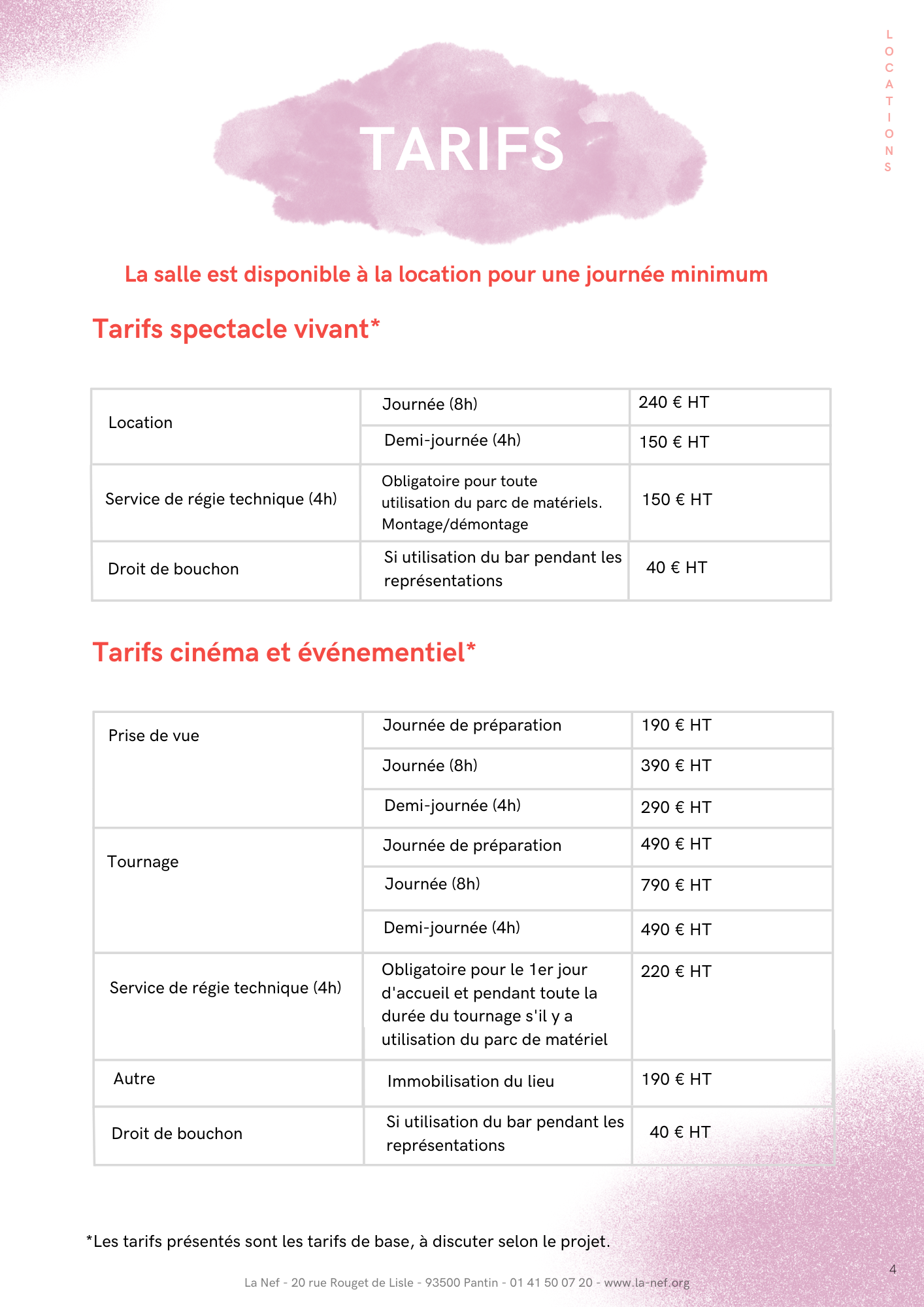 Située à Pantin, aux portes de Paris et à proximité du métro, La Nef propose à la location ses différents espaces pour des spectacles, des répétitions, des tournages et prises de vue. Pas de location possible pour les particuliers ou les événements privés.
