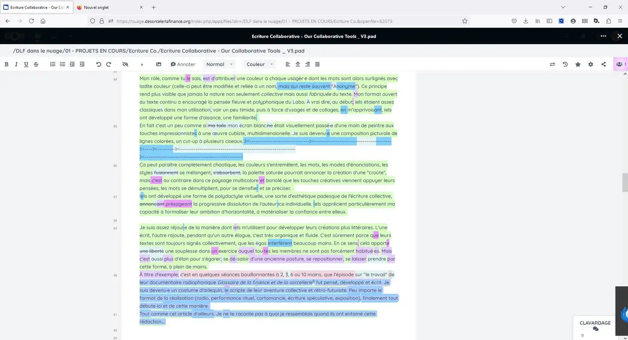 Comme tu le sais, j’attribue une couleur à chaque usagèr·e dont les mots sont alors surlignés avec ladite couleur (celle-ci peut être modifiée et reliée à un nom, mais qui reste souvent « Anonyme »). Ce principe rend plus visible que jamais la nature non seulement collective mais aussi fabriquée du texte. Mon format ouvert au texte continu a encouragé la pensée fleuve et polyphonique du Labo. À vrai dire, au début, iels étaient assez classiques dans mon utilisation, voir un peu timide, puis à force d’usages et de collages, en m’apprivoisant, iels ont développé une forme d’aisance, une familiarité.