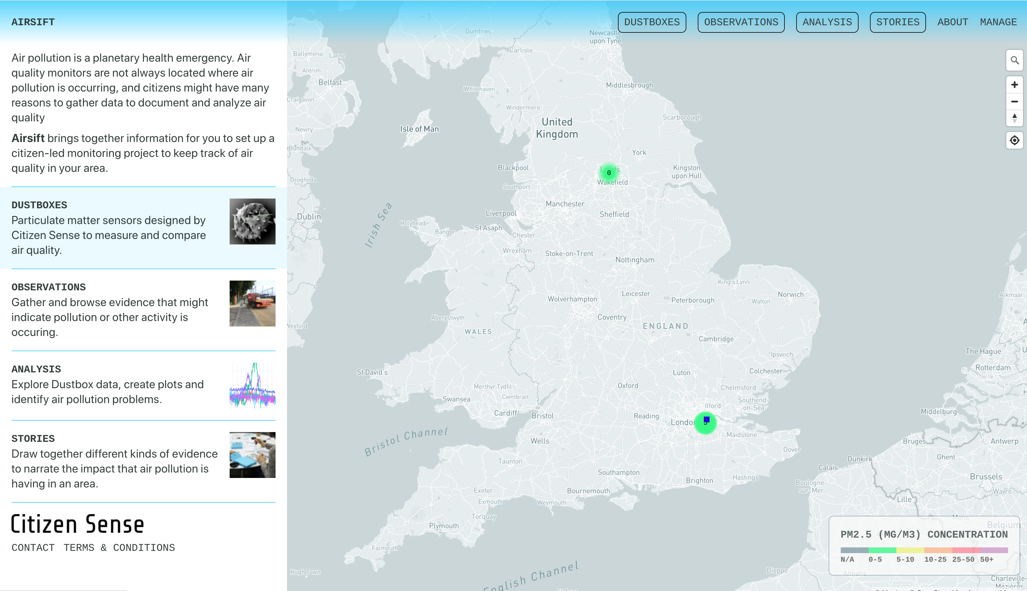 When you arrive on the Airsift page, you will notice a left-hand sidebar that will guide you in navigating the different areas of the site, including Dustboxes, Observations, Analysis, and Stories. On the right, you will notice a map with values in coloured circles. You can navigate the map by clicking and dragging it, and zoom in and out using your mouse/trackpad. It is also possible to search for a location or use your current location to re-locate the map in the top right-hand corner of the site.