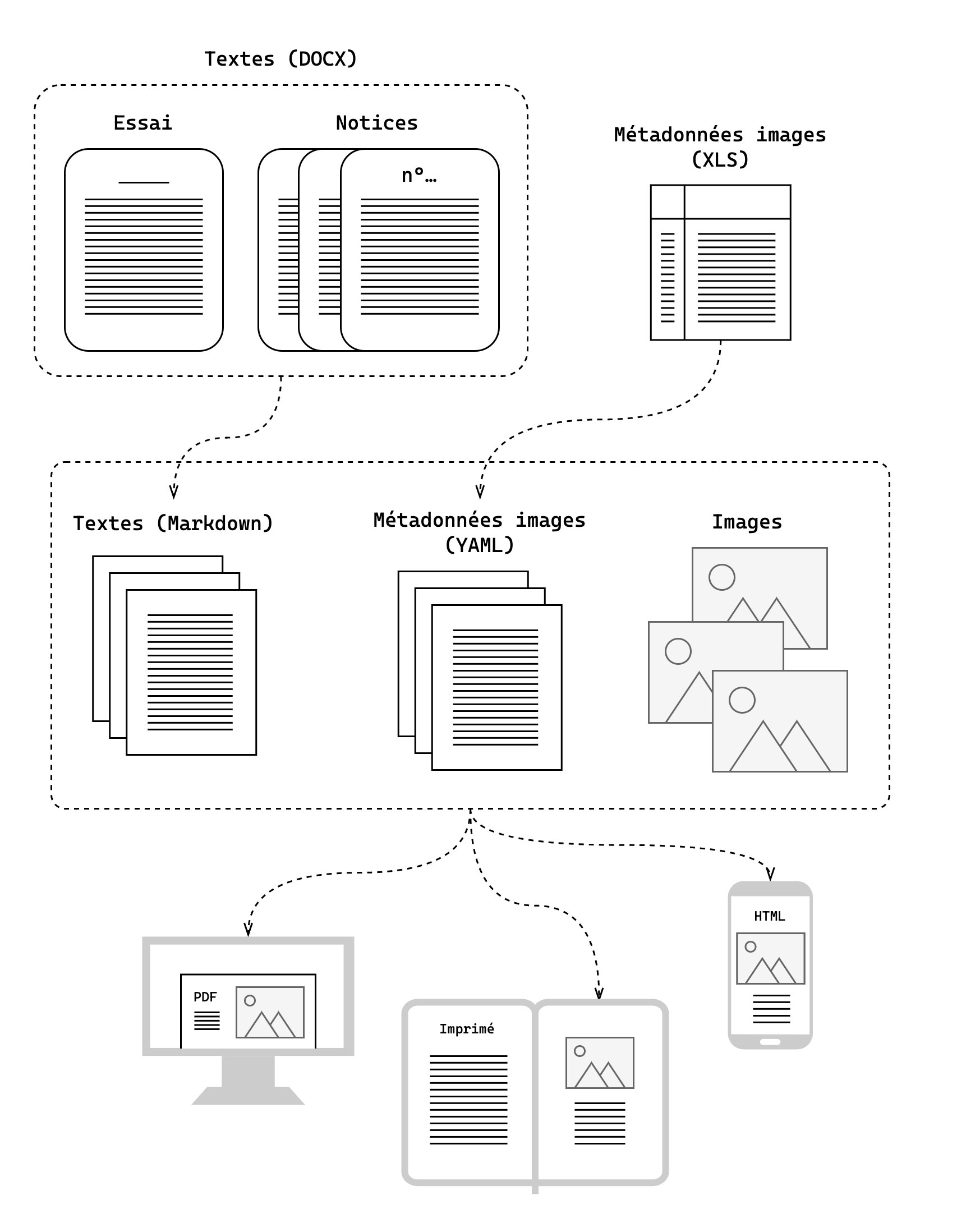 Materials : Texts (Docx) > Texts (Markdown) + Images Metadata (XLS) > Images Metadata (YAML) + Images > HTML/CSS/Paged.js > Website + Digital PDF + Ready-to-print PDF