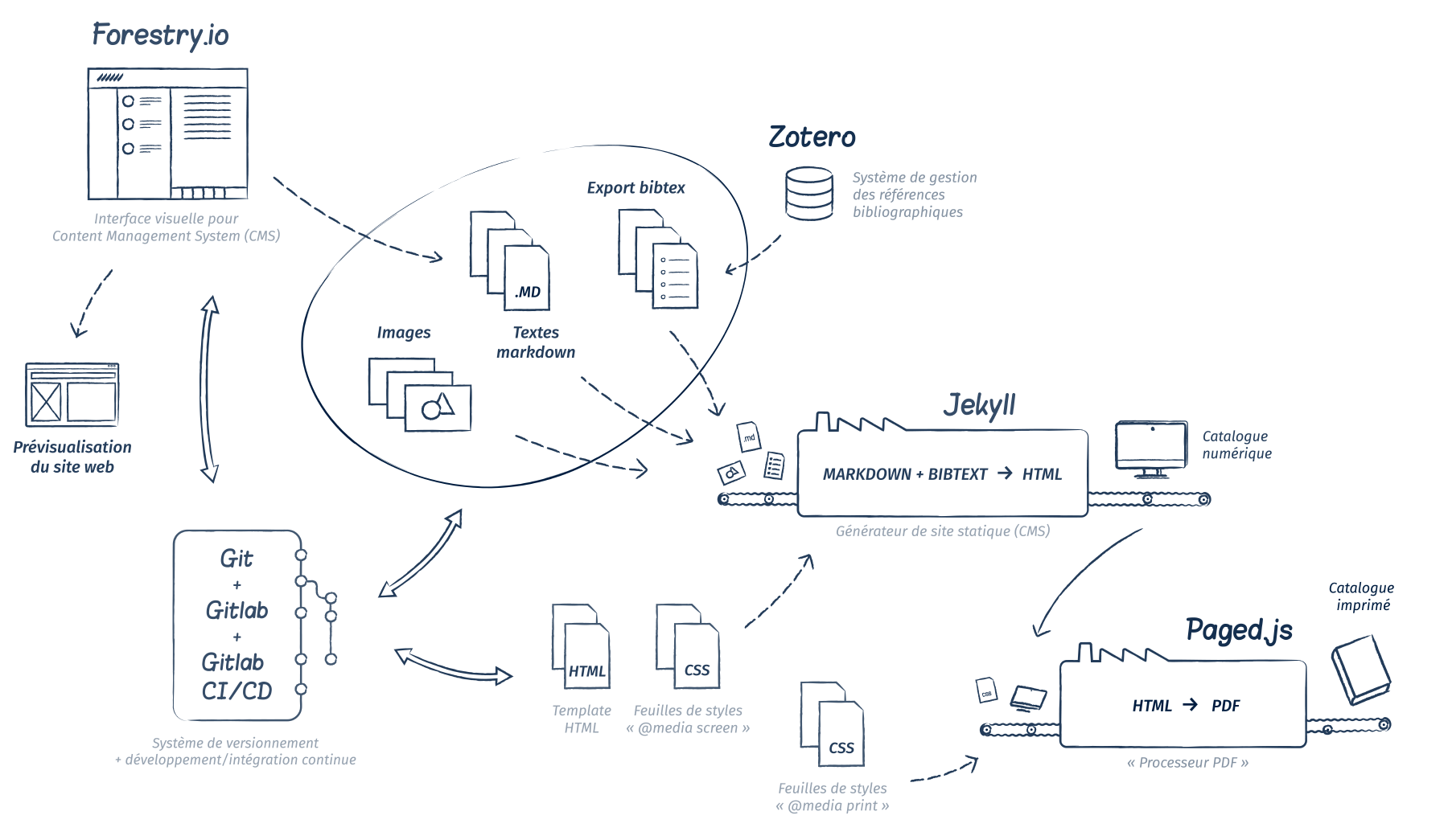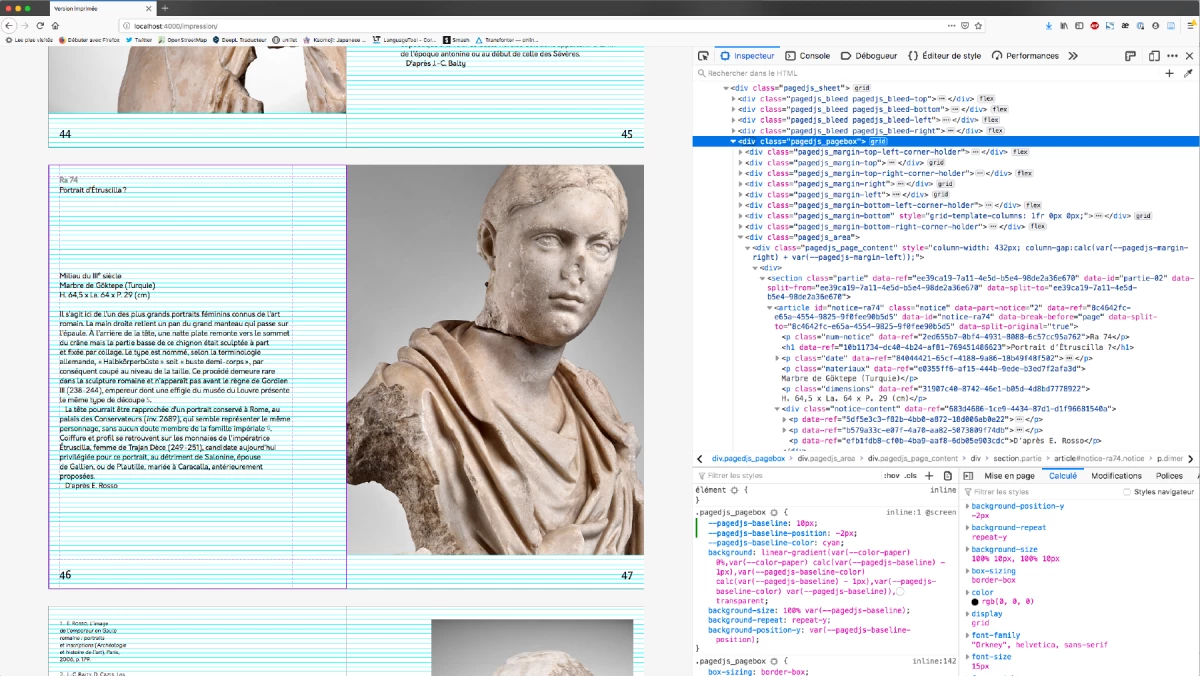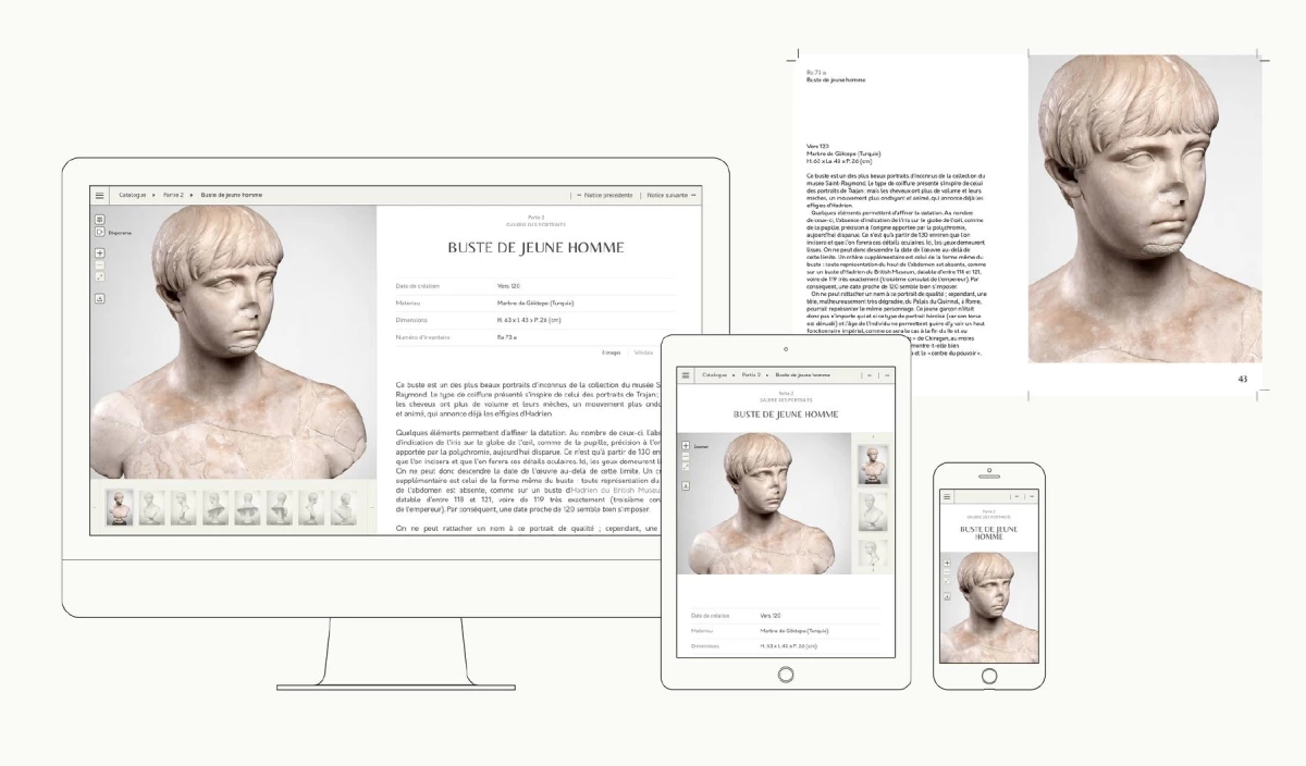 Julie Blanc and Antoine Fauchié developed a multi-format catalogue for the Saint Raymond Museum (Toulouse). The catalogue presents part of the museum’s collection devoted to a group of Roman sculptures discovered at a place called Chiragan in Martres-Tolosane. Inspired by the Getty Museum in Los Angeles, they designed and developed a digital version of the catalogue and a printed version. To do this, they proposed a publishing chain created specifically for the museum team and based on a set of open-source tools that they assembled (Jeckyll, Zotero, Forestry, Gitlab, paged.js, etc.). The graphic and interactive design of the site was developed entirely in HTML, CSS and Javascript. The printed version uses Paged.js to generate the printed catalogue directly from the web browser. This means that the content only needs to be entered and corrected once by the museum to generate both versions.