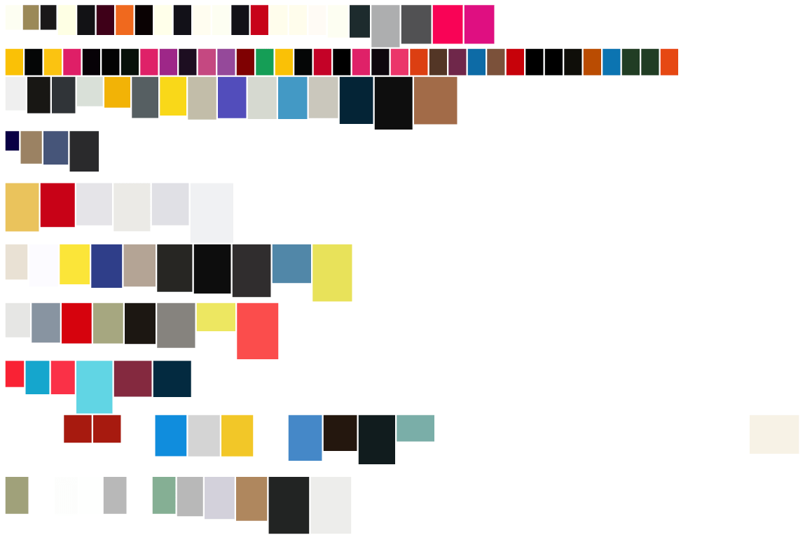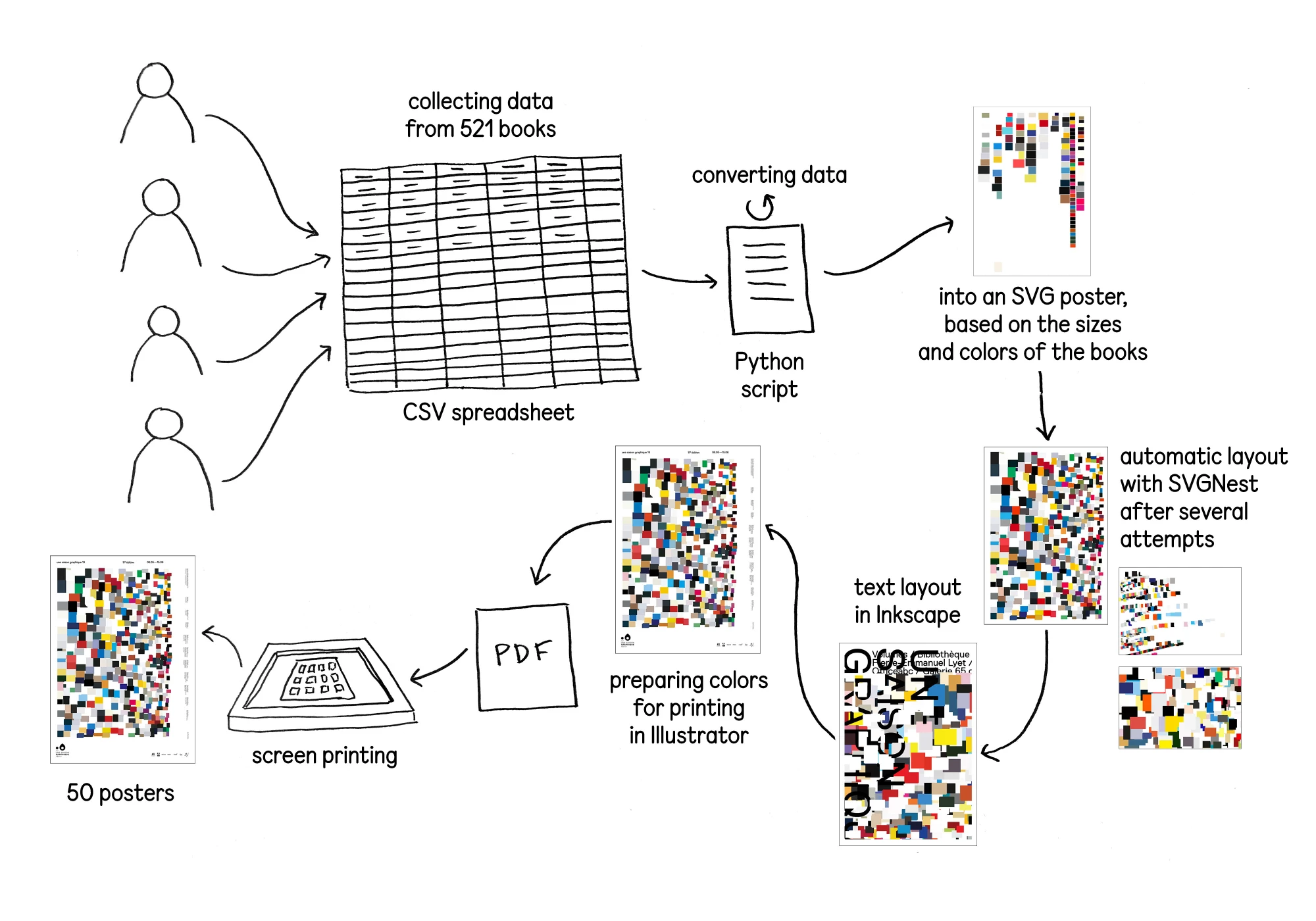 For the exhibition at the University Library, we chose to produce a poster that plays on the diversity of the books and showcases them all. A Python script was used to generate an SVG file of rectangles correctly sized and coloured according to the dominant colour of the cover.