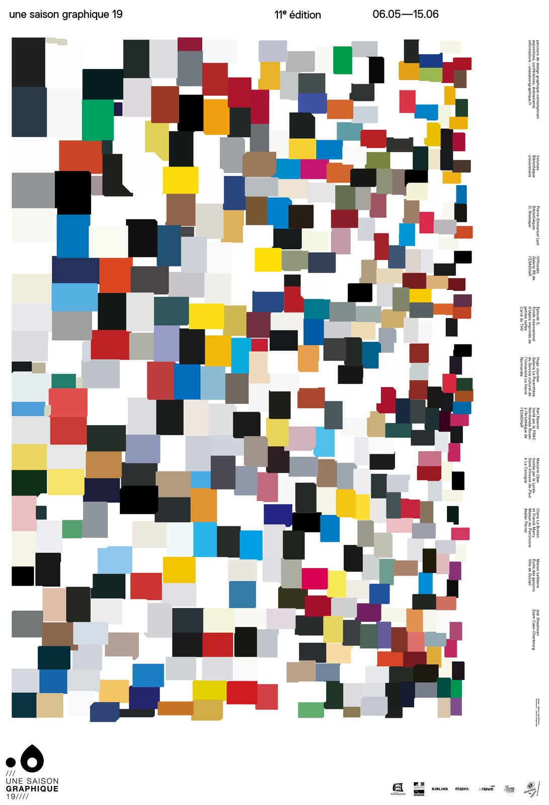 The programme poster published for the Volumes exhibition as part of Une saison graphique is the result of a collaboration between Claire Colnot, Benjamin Lahitte, Jean-Marc Saint-Paul, Amish Shah and Julien Bidoret, designers who are members of the Maison des éditions, and was printed by Lézard graphique.
