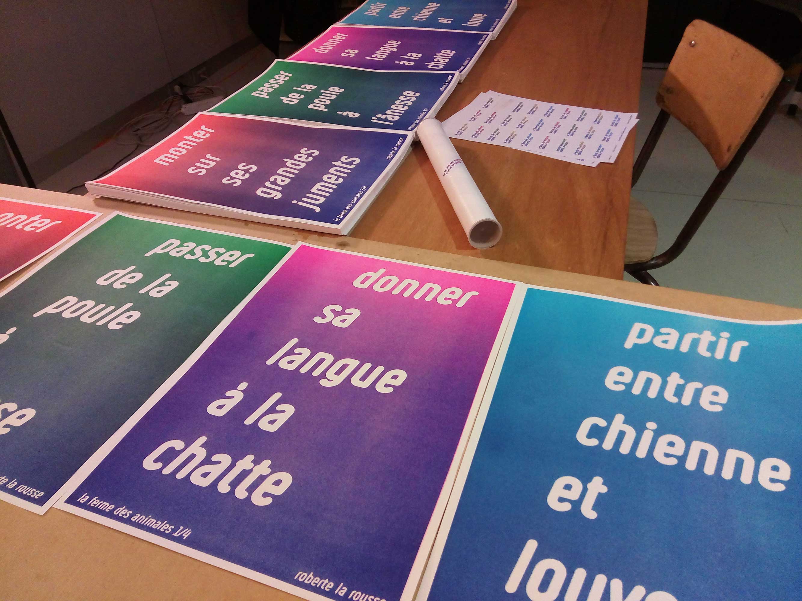Sous la titre La ferme des animales, Roberte la Rousse propose quatre affiches A3, imprimées en risographie qui détournent des expressions idiomatiques françaises comportant des noms d’animales mâles.