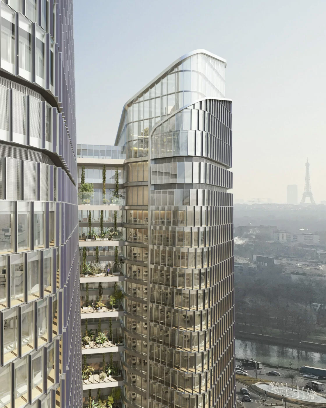 Cette perspective aérienne met en scène l’insertion du projet dans le paysage parisien, avec la Tour Eiffel visible à l’arrière-plan, et valorise une relation directe à la ville et à son horizon. La présence marquée de terrasses végétalisées, de dispositifs de façade intégrant des panneaux solaires et de nombreux espaces extérieurs accessibles participe à la construction d’une image de tour ouverte, durable et largement connectée à son environnement. Cette représentation insiste sur les qualités paysagères, environnementales et visuelles du projet, tout en proposant une vision idéalisée des usages et des vues offertes depuis les espaces en hauteur.