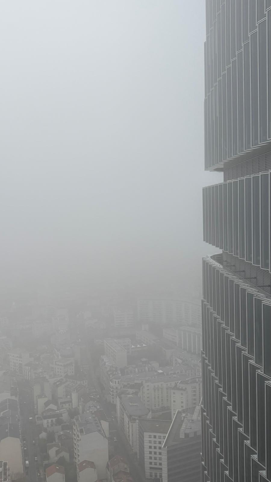 Prise depuis l’une des terrasses en hauteur de la tour, cette image montre une situation dans laquelle le bâtiment se trouve partiellement au-dessus de la couche nuageuse. La ville, largement effacée par les conditions atmosphériques, devient difficilement perceptible, tandis que l’horizon disparaît presque entièrement. Cette position « hors sol », où le bâti se détache des repères urbains et paysagers habituels, interroge la naturalité de l’expérience proposée et révèle le caractère extrême de la verticalité recherchée. Plus qu’une ouverture sur la ville, la hauteur produit ici une forme de distance, soulignant l’effort technique et symbolique nécessaire pour maintenir des espaces habités à une altitude où la relation au sol et au contexte urbain tend à s’effacer.